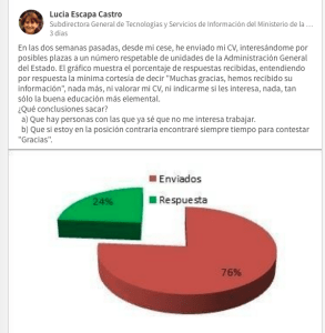 ruegosMe impresionó el otro día en LinkedIn el mensaje de una joven que comentaba que había enviado su Curriculum Vitae a «un número respetable de unidades de la administración general del Estado» y se lamentaba que solo recibió respuesta a la cuarta parte de los enviados. El 75% no es que no ofreciese respuesta favorable o una promesa, sino que ni siquiera acusó recibo o formal agradecimiento de su remisión, como tampoco le mintieron cariñosamente (“ya la llamaremos”). O sea, ni caso.