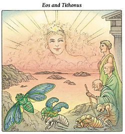 Aurora encontró agonizante a Titonos así que rogó a Zeus que le diese la inmortalidad. El Dios accedió y se la concedió, pero Eros olvidó pedirle además la eterna juventud para su amado, de manera que con el tiempo Titonos fue marchitándose y sin poder morir (encogido, débil, voz rota, etcétera). Un regalo de inmortalidad envenenado. Titonos solo quería volver a los tiempos de pasada juventud en los prados, cantando y saltando, así que Eos se apiadó de su anciano amado y le dijo: