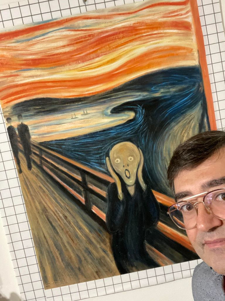 Me venía frecuentemente la imagen de El Grito de Munch, así que encargué a un estudio artístico una copia del cuadro con la misma técnica y realizado manualmente por un artista (óleo y pastel sobre cartón), ajustado al tamaño original, que me fue remitida a mi domicilio, donde me acompaña cuando trabajo en el hogar. La copia ha sido un trabajo espléndido, económico y cuidadoso, que me permite disfrutar de su contemplación con mayor inmediatez y exclusividad, que si estuviese en la Galería Nacional de Noruega, donde se alberga el original.