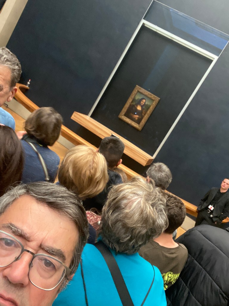 Ahora en el Louvre, pude asistir a la contemplación de la Gioconda, del gran Leonardo da Vinci. O de la que se supone debe ser tal obra, porque no solo existe una distancia propia de foso medieval respecto del cuadro hasta la cinta que impide aproximarse a los visitantes, sino que de su visión te separa una multitud apiñada de quienes intentan asomarse sobre las cabezas vecinas para atisbar el cuadro en la lejanía, o elevando el móvil para hacer fotos.